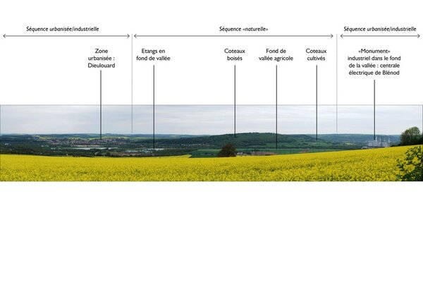 La vallée vers Pont-à-Mousson, cadrée par les coteaux boisés, marquée par l’urbanisation, l’industrie (centrale électrique de Blénod, fonderie Saint-Gobain) et les nombreux étangs laissés par les gravières
